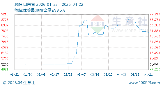 4月22日,生意社顺酐基准价为7800.00元/吨,与本月初(8150.00元/吨)相比,下降了4.29%。