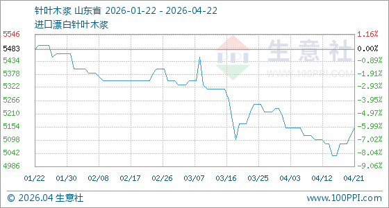 4月22日,生意社针叶木浆基准价为5150.00元/吨,与本月初(5233.33元/吨)相比,下降了1.59%。