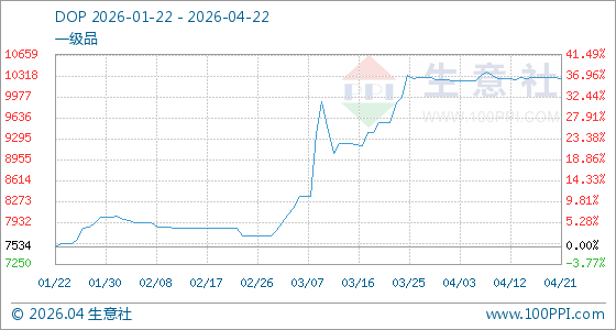 4月22日,生意社DOP基准价为10266.67元/吨,与本月初(10259.17元/吨)相比,上涨了0.07%。