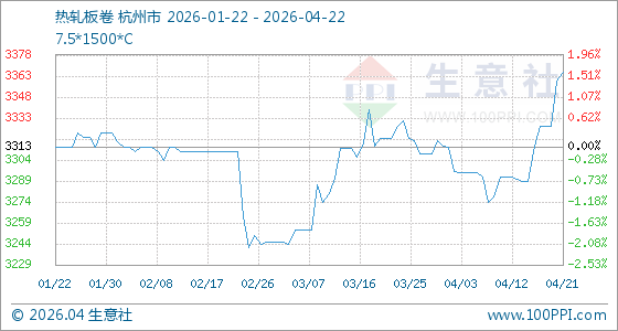 4月22日,生意社热轧板卷基准价为3366.00元/吨,与本月初(3314.00元/吨)相比,上涨了1.57%。