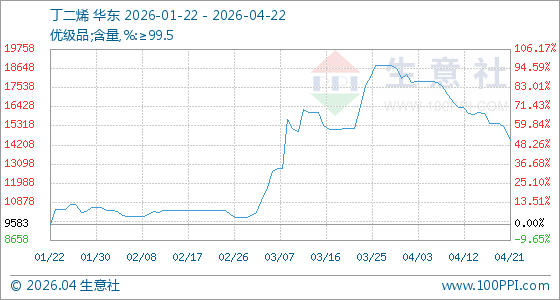 4月22日,生意社丁二烯基准价为14500.00元/吨,与本月初(18066.67元/吨)相比,下降了19.74%。