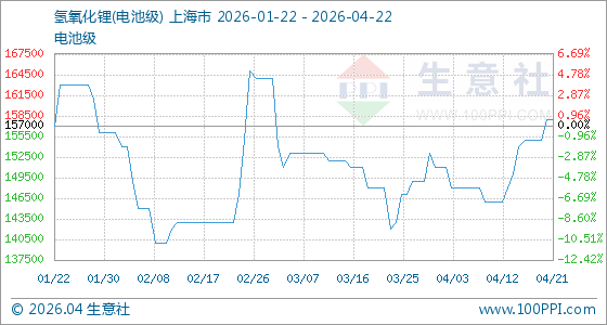 4月22日,生意社氢氧化锂(电池级)基准价为158000.00元/吨,与本月初(151000.00元/吨)相比,上涨了4.64%。