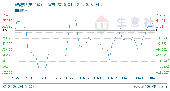 4月22日生意社碳酸锂(电池级)基准价为170000.00元/吨
