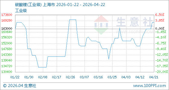 4月22日,生意社碳酸锂(工业级)基准价为168000.00元/吨,与本月初(157000.00元/吨)相比,上涨了7.01%。
