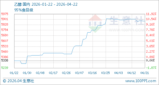4月22日,生意社乙醇基准价为5880.00元/吨,与本月初(5897.22元/吨)相比,下降了0.29%。