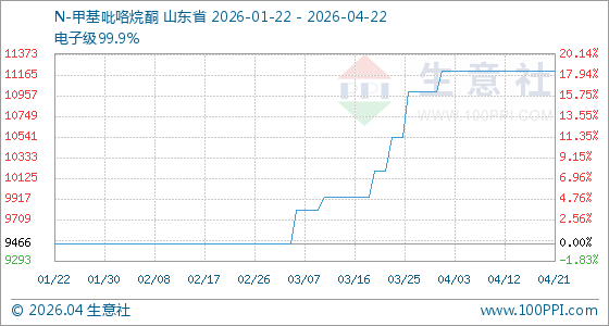 4月22日,生意社N-甲基吡咯烷酮基准价为11200.00元/吨,与本月初(11000.00元/吨)相比,上涨了1.82%。