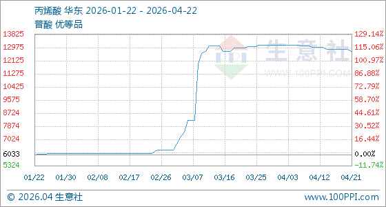4月22日,生意社丙烯酸基准价为12750.00元/吨,与本月初(13116.67元/吨)相比,下降了2.8%。