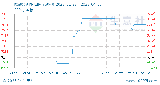 4月23日,生意社醋酸异丙酯基准价为7681.11元/吨,与本月初(7775.71元/吨)相比,下降了1.22%。