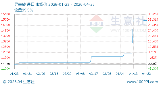 4月23日,生意社异辛酸基准价为15000.00元/吨,与本月初(12000.00元/吨)相比,上涨了25.00%。