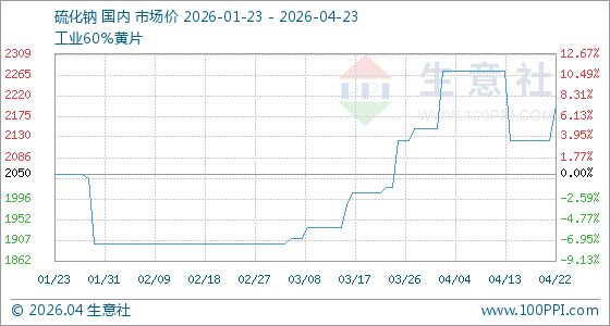 4月23日,生意社硫化钠基准价为2197.50吨,与本月初(2147.50吨)相比,上涨了2.33%。