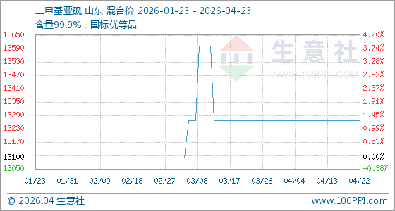 4月23日,生意社二甲基亚砜基准价为13266.67元/吨,与本月初持平。