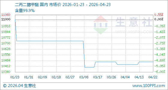 4月23日,生意社二丙二醇甲醚基准价为10466.67元/吨,与本月初(10433.33元/吨)相比,上涨了0.32%。