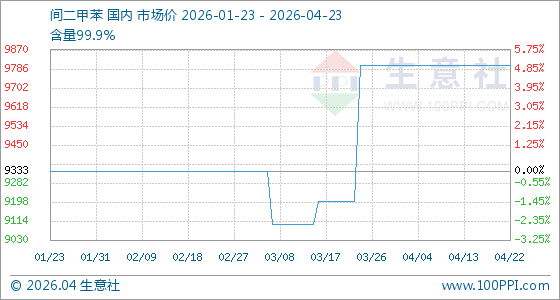 4月23日,生意社间二甲苯基准价为9800.00元/吨,与本月初持平。