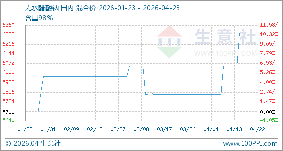 4月23日,生意社无水醋酸钠基准价为6300.00元/吨,与本月初(5840.00元/吨)相比,上涨了7.88%。