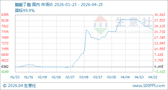 4月23日,生意社醋酸丁酯基准价为7800.00元/吨,与本月初(8025.00元/吨)相比,下降了2.8%。
