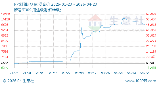 4月23日,生意社PP(纤维)基准价为9700.00元/吨,与本月初持平。