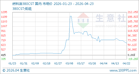 4月23日,生意社燃料油380CST基准价为668.00美元/吨,与本月初(802.00美元/吨)相比,下降了16.71%。
