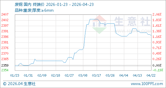 4月23日,生意社废钢基准价为2388.33元/吨,与本月初(2389.42元/吨)相比,下降了0.05%。