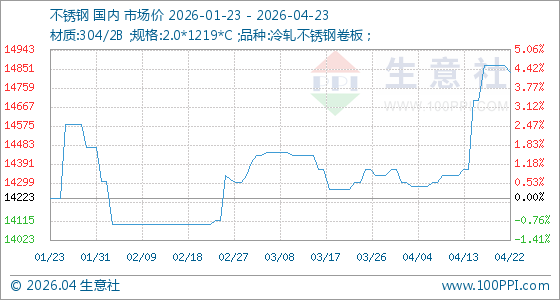 4月23日,生意社不锈钢基准价为14833.33元/吨,与本月初(14366.67元/吨)相比,上涨了3.25%。