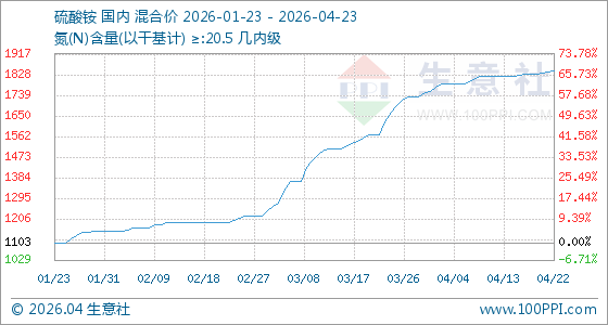 4月23日,生意社硫酸铵基准价为1843.33元/吨,与本月初(1755.00元/吨)相比,上涨了5.03%。