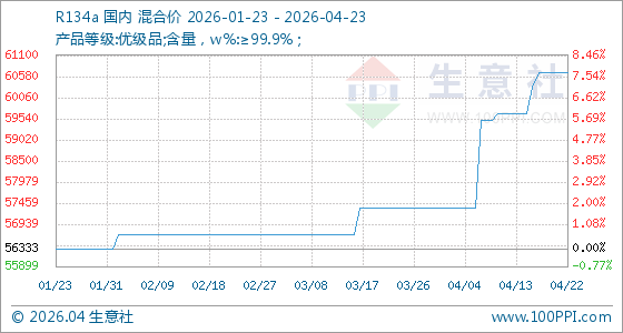 4月23日,生意社R134a基准价为60666.67元/吨,与本月初(57333.33元/吨)相比,上涨了5.81%。
