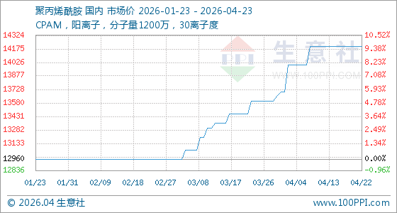 4月23日,生意社聚丙烯酰胺基准价为14200.00元/吨,与本月初(13700.00元/吨)相比,上涨了3.65%。