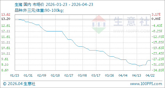 4月23日,生意社生猪基准价为9.48元/公斤,与本月初(9.73元/公斤)相比,下降了2.57%。