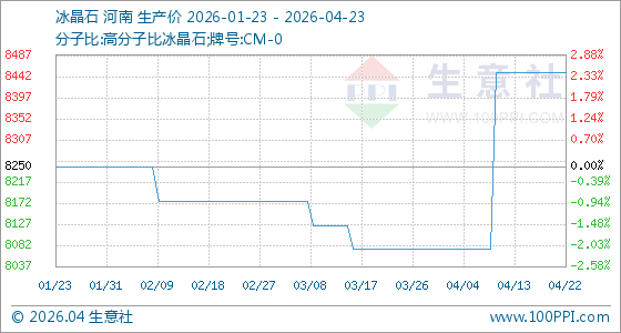 4月23日,生意社冰晶石基准价为8450.00元/吨,与本月初(8075.00元/吨)相比,上涨了4.64%。