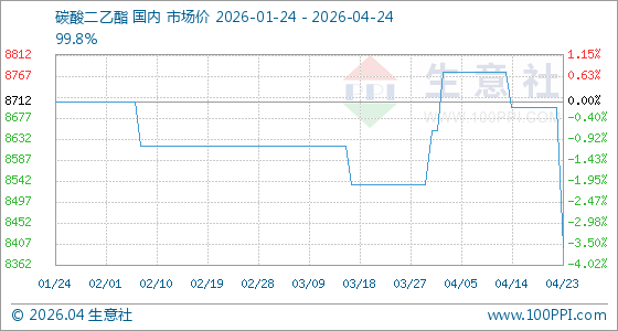 4月24日,生意社碳酸二乙酯基准价为8400.00元/吨,与本月初(8650.00元/吨)相比,下降了2.89%。