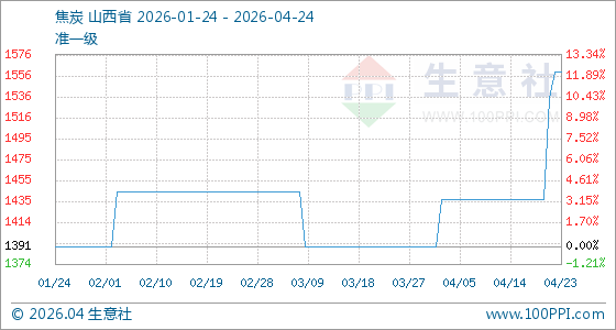 4月24日,生意社焦炭基准价为1560.00元/吨,与本月初(1391.25元/吨)相比,上涨了12.13%。