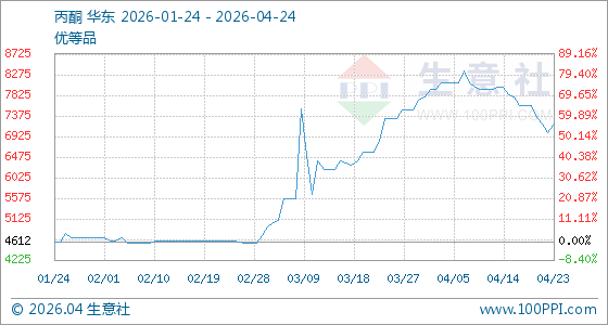 4月24日,生意社丙酮基准价为7200.00元/吨,与本月初(7800.00元/吨)相比,下降了7.69%。