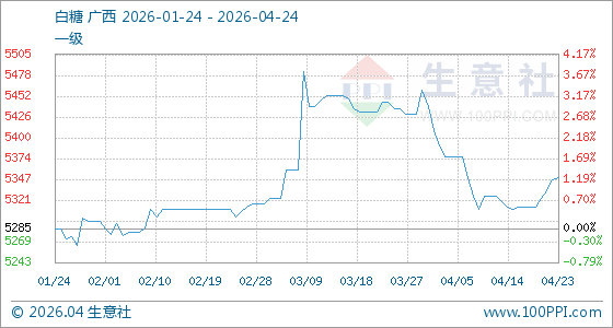 4月24日,生意社白糖基准价为5350.00元/吨,与本月初(5440.00元/吨)相比,下降了1.65%。