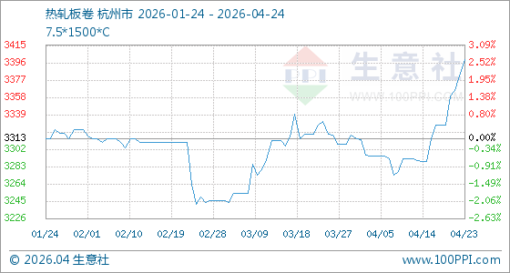 4月24日,生意社热轧板卷基准价为3400.00元/吨,与本月初(3314.00元/吨)相比,上涨了2.60%。