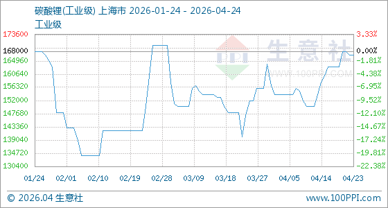 4月24日生意社碳酸锂(工业级)基准价为167000.00元/吨