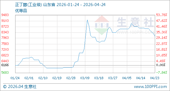 4月24日生意社正丁醇(工业级)基准价为8100.00元/吨