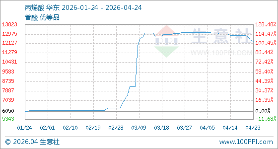 4月24日,生意社丙烯酸基准价为12316.67元/吨,与本月初(13116.67元/吨)相比,下降了6.1%。