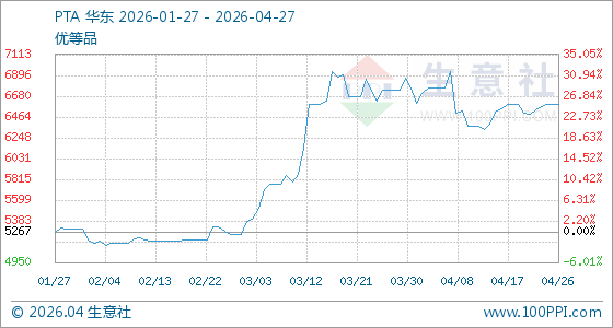 4月27日,生意社PTA基准价为6591.03元/吨,与本月初(6761.93元/吨)相比,下降了2.53%。