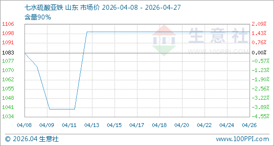 4月27日,生意社七水硫酸亚铁基准价为1100.00元/吨。