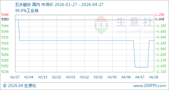 4月27日,生意社五水硼砂基准价为5325.00元/吨,与本月初持平。