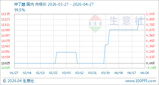 4月27日生意社仲丁醇基准价为11125.00元/吨
