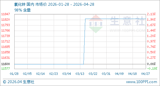 4月28日,生意社氯化锌基准价为11825.00元/吨,与本月初持平。