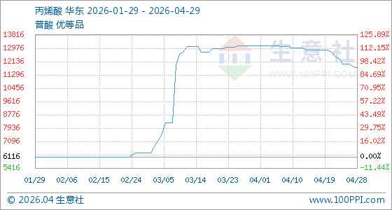 4月29日,生意社丙烯酸基准价为11750.00元/吨,与本月初(13116.67元/吨)相比,下降了10.42%。